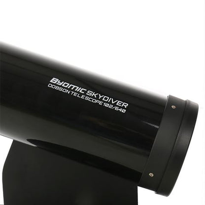 De Byomic SkyDiver 102/640 is uitgerust met een Dobsonmontering waardoor de telescoop eenvoudig azimutaal (horizontaal en verticaal) te bewegen is. Doordat de Dobson telescoop alleen maar op een vlakke ondergrond geplaatst hoeft te worden heb je niet veel ruimte nodig en kun je direct beginnen met observeren. De Dobsonmontering zorgt er ook voor dat de telescoop snel opgeborgen kan worden en weinig ruimte inneemt. Bij de Byomic SkyDiver 102/640 is in de montering een handvat gemaakt, waardoor de telescoop eenvoudig te dragen en verplaatsen is.