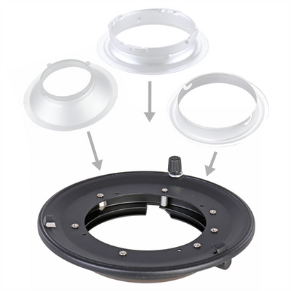 De adapterring (ook bekend als speedring) DBBW-EX van Falcon Eyes is verwisselbaar, waardoor hij ook geschikt is voor andere merken, zoals Elinchrom, Falcon Eyes, Linkstar, StudioKing, Profoto, Multiblitz, Menik, DigiLite, CompactLite, Digix, Pro-x, Qihe, Lastolite en Aurora, Richter, Hensel, Varilux, Xeuro, Magnolux, Balcar, Profilux, Xenolux en meer. Hiervoor dient een extra adapter aangeschaft te worden. Zie hiervoor de optionele accessoires.