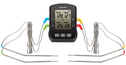 Levenhuk Wezer Cook MT90 is een geavanceerd model van een kookthermometer met vier thermoprobes. Elke thermoprobe is bevestigd aan een 1m (3,3 ft) lange flexibele draadkabel. Het apparaat kan de temperatuur meten van verschillende gerechten die tegelijkertijd worden gekookt, en het maakt niet uit waar het voedsel wordt geplaatst: in de oven, op het fornuis of op de grill. De gegevens worden zichtbaar weergegeven op het ingebouwde scherm: de cijfers zijn groot en contrasterend en er is een ingebouwde achtergrondverlichting.