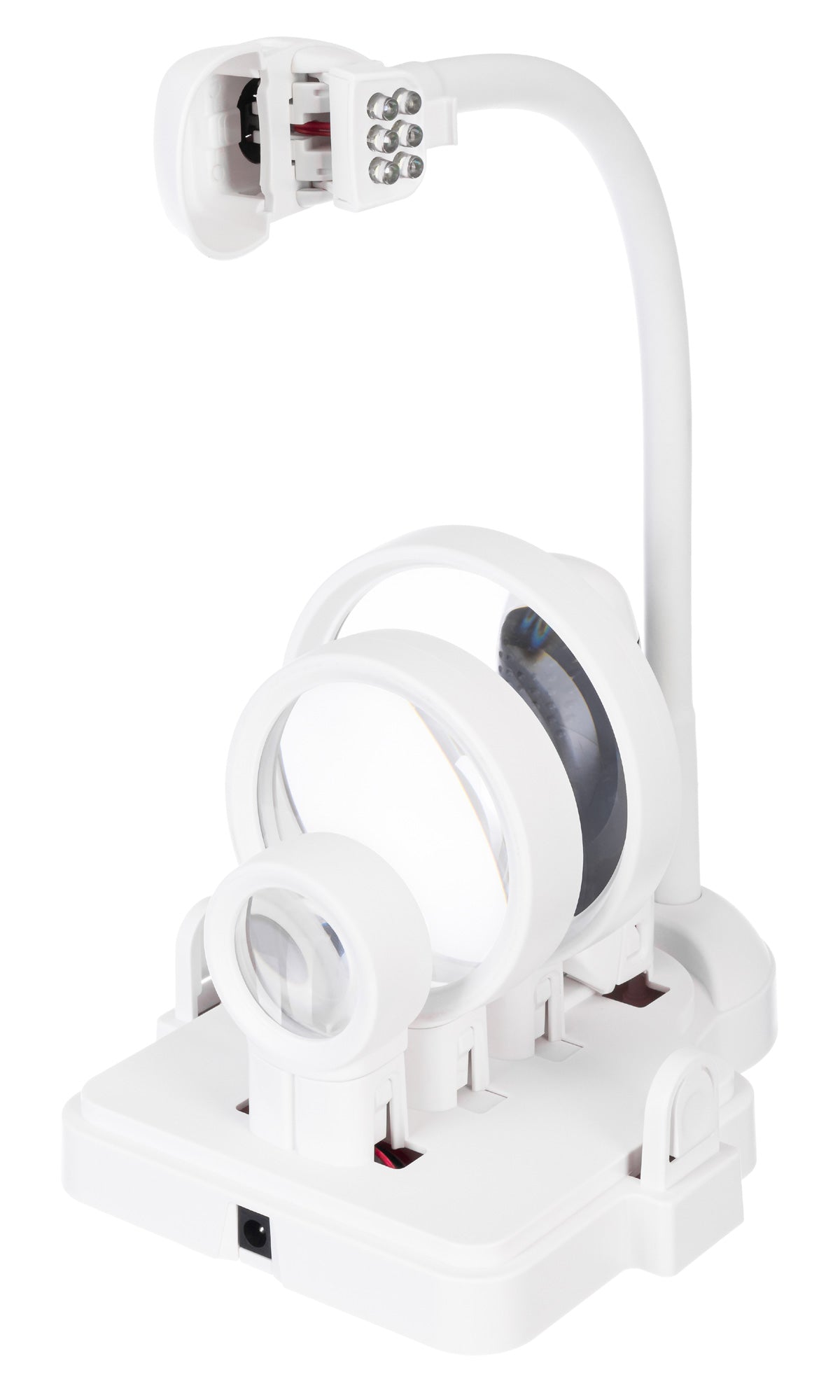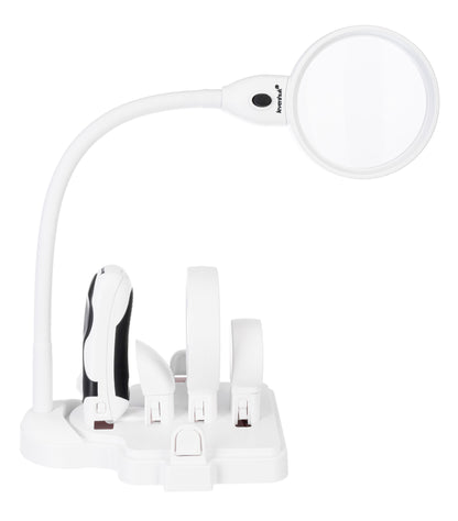 Deze vergroter combineert verschillende onmisbare instrumenten in één. Het beschikt over drie handheld -vergrootders, drie vergrootders op een tafelbasis, praktische instrumenthouders en een bureaulamp. De basis neemt niet veel ruimte in beslag.